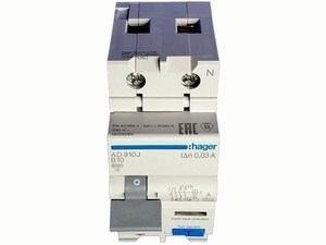 Rikkevoolukaitse koos kaitselülitiga 1-faasiline B 10A, 30mA(0,03A), Hager, AD910J, 104069