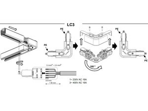 3-faasiline 250/400V AC, 16A, mõõdud on 102 × 102 × 32,5 mm, must plastmassist korpus. Võib kasutada toiteotsikuna. Kaabli maksimaalne ristlõige on 5×2,5 mm². Maanduselementide asendit saab paigaldamise käigus muuta. Asendi muutmiseks tuleb avada L-kujuline ühendusdetail, pöörata nurk 180° ja paigaldada kate tagasi.