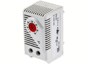 габариты 60×33×43 мм, 10A, 250B, 0°С..+60°С, наружной установки на DIN-рейке, со встроенным термобиметаллическим датчиком температуры воздуха. Нормально замкнутый контакт, размыкается при увеличении температуры. Применяется для управления нагревателем, калорифером.